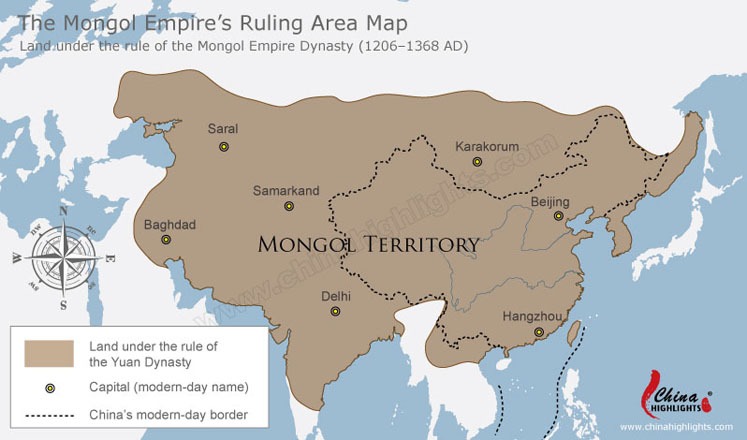 This map shows the land of the Mongolian Empire (1271 – 1368) and the modern-day borders of China and Mongolia. This was the highest point of China’s land area. The capital city was Beijing during this period.